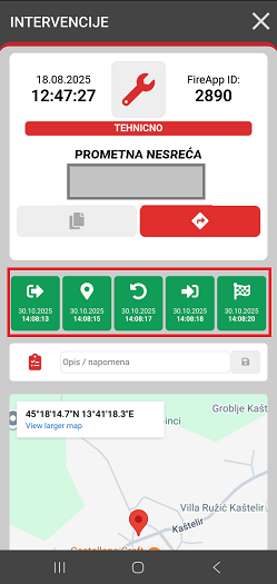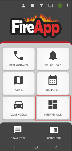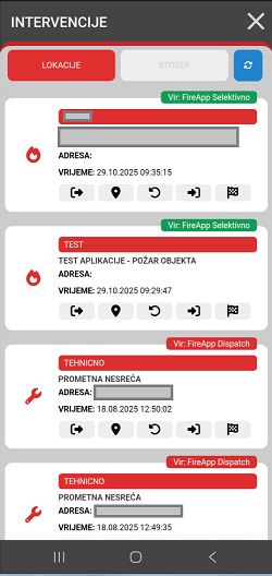 Popis INTERVENCIJE prikazuje sve intervencije za vašu udrugu, a također dobivamo informacije o točnoj lokaciji i izvještavamo o prvom izvozu i sljedećim statusima. Također dobivamo podatke za navigaciju do mjesta intervencije i informacije o tome tko je izvršio aktivaciju (Dispatch, Selektivno, Stožer)