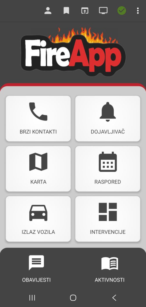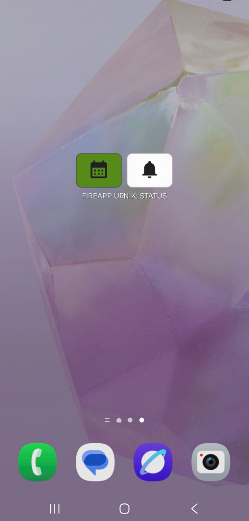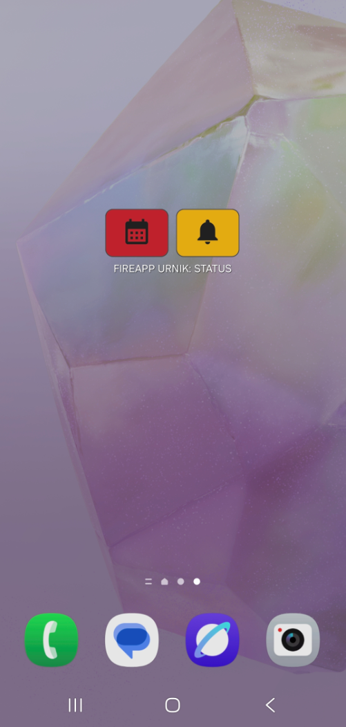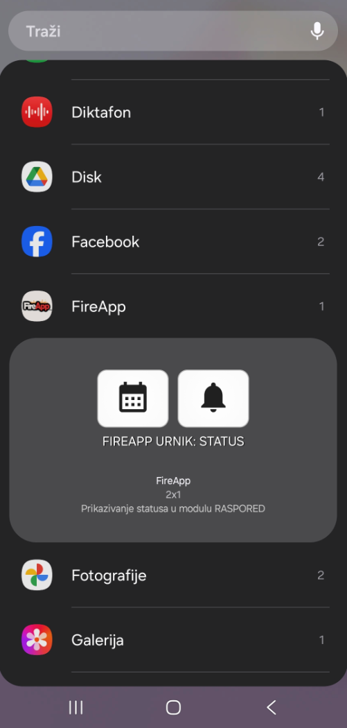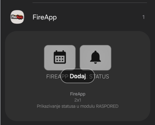 Odabirom opcije ''Widgeti'' u izborniku ispod otvorit će se opcije za dodavanje widgeta dostupnih na mobilnom telefonu. Unaprijed postavljeni widgeti dostupni su u gornjem dijelu, a widgeti aplikacija dostupni su u donjem. Pronalazimo FireApp i odabiremo opciju RASPORED. Uz dodatnu potvrdu dodajemo ga na početni zaslon: