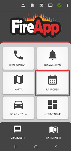 Budući da je odsutnost i posljedična nedostupnost vatrogasca u slučaju intervencije vrlo važna, ovaj modul omogućuje stalno praćenje trenutne i predviđene dostupnosti tima. U modulu RASPORED korisnik može unijeti svoju dostupnost ili predviđene izostanke za razdoblje od 30 dana unaprijed. Dostupnost cijelog tima prikuplja se u zajedničkom grafu prikazanom u administraciji i na zaslonu u vatrogasnoj postaji te u aplikaciji za korisnike koji imaju dopuštenje pregleda po imenu. Osim toga, zelenom kvačicom možete označiti svoju 100%-tnu dostupnost, prisutnost, dežurstvo kod kuće ili izvanredna dežurstva u narednim danima, u skladu s internim dogovorom udruge.