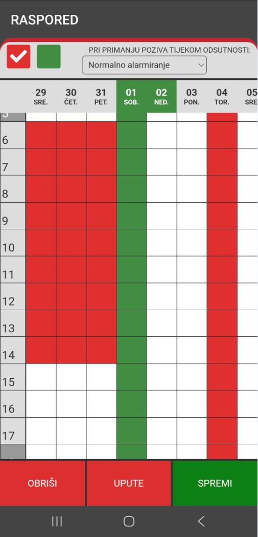 Zatim unesite svoj odabir dodirom na satne termine određenog dana tako da postanu crveni ili zeleni. Za uklanjanje pojedinačnog satnog termina ponovno dodirnite termin.