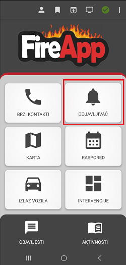 Izborniku za odabir alarma pristupa se s glavne stranice aplikacije pritiskom na gumb ''DOJAVLJIVAČ''.
