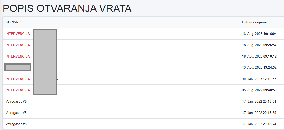 Ako koristite našu dodatnu opremu i sustav za otvaranje vrata, imate pristup i odjeljku ''POPIS OTVARANJA VRATA''. Klikom na njega otvorit ćete popis s ispisom signala poslanih na vrata u vatrogasnoj postaji.