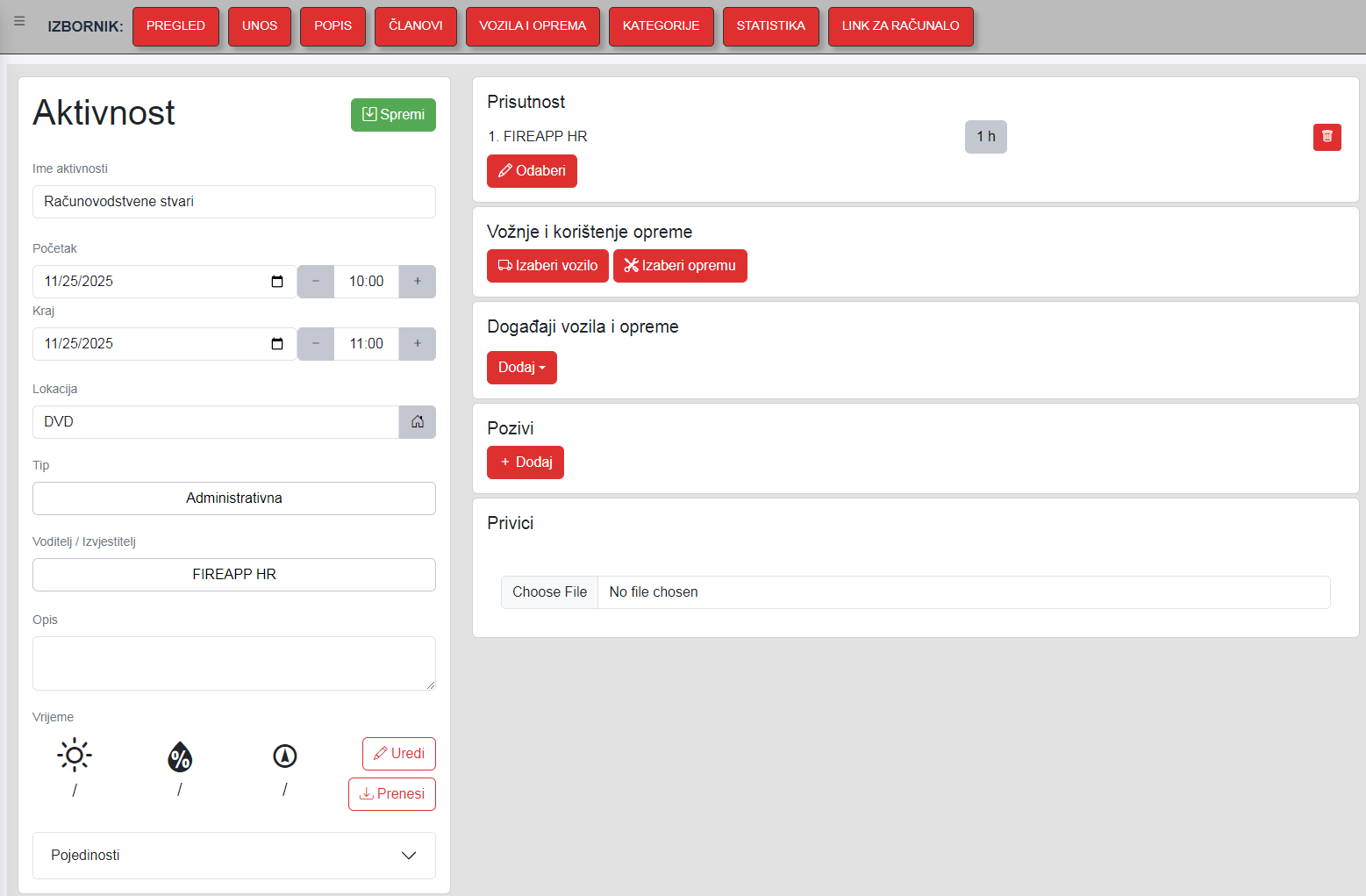 "AKTIVNOSTI" je dodatni modul u FireApp sustavu i plaća se. Riječ je o elektroničkom dnevniku putem kojeg korisnici unose svoj rad u DVD, a administratori imaju pristup pregledu i statistikama. Ako niste unajmili modul, imate pristup DEMO verziji u kojoj se prikazuju podaci i statistike za posljednjih 10 unosa. Svoje aktivnosti možemo unijeti prijavom u web administraciju ili putem aplikacije.