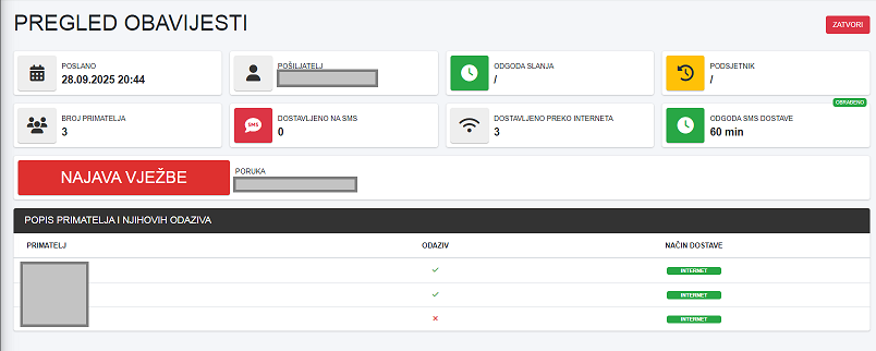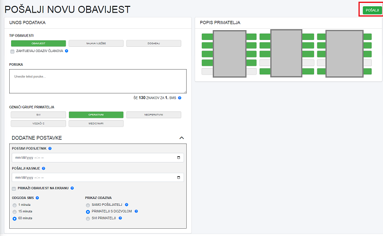 Nakon što smo uspješno unijeli sve potrebne parametre, unijeli obavijest i odabrali sve odgovarajuće primatelje, možemo poslati obavijest. Obavijest šaljemo klikom na zeleni gumb POŠALJI u gornjem desnom kutu.