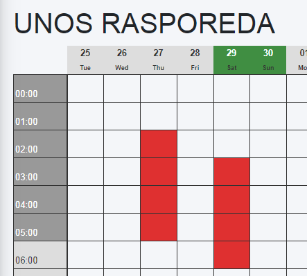 Kada kliknete na pojedinačni prozor, prozor postaje crven, što označava najavu odsutnosti za određeni sat u danu.